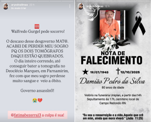 “Walfredo Gurgel pede socorro. O descaso desse desgoverno mata… Fátima Bezerra, a culpa é sua”, desabafou a nora do paciente, Aryedna Lima, nas redes sociais. Ela contou que Damião passou horas deitado em uma maca com uma fratura exposta nas costas, aguardando exame. O idoso não resistiu aos ferimentos e morreu antes de ser operado, segundo a família. Walfredo na UTI