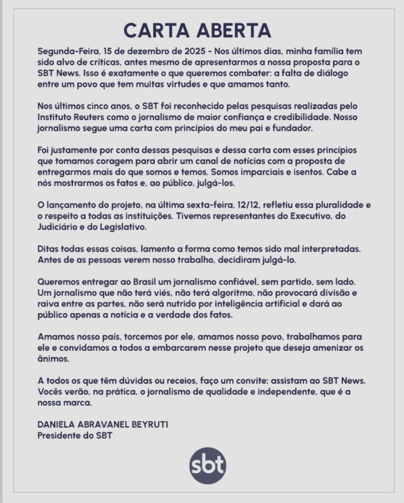 A presidente do SBT, Daniela Abravanel Beyruti, se pronunciou nesta segunda-feira (15/12) após polêmicas nas redes sociais por ter tido a presença do presidente Lula, de Alexandre de Moraes, e outras autoridades, em evento de lançamento do SBT News, no âmbito físico da emissora.