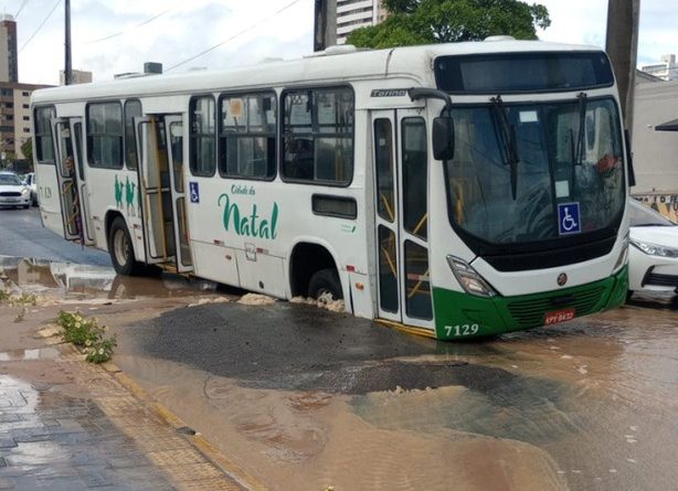 Asfalto cede e ônibus cai em buraco na Avenida Prudente de Morais