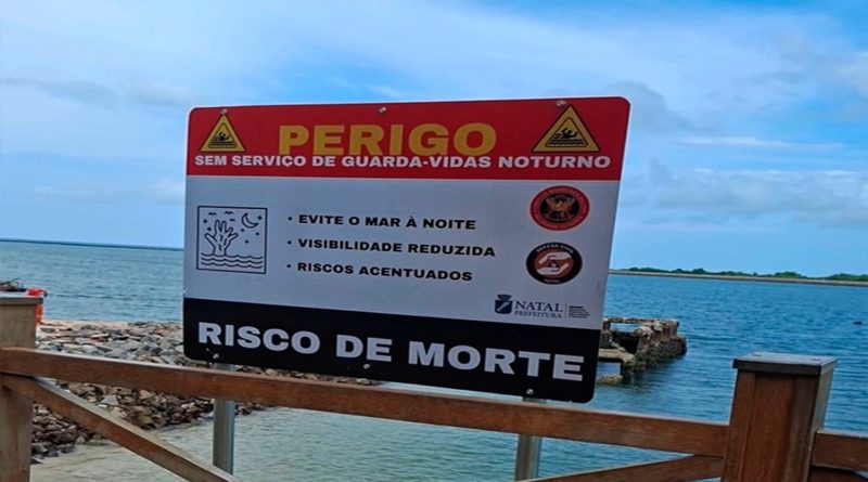 Além disso, a placa traz a informação de risco de morte. A sinalização também apresenta a orientação para que a população evite o mar à noite, com visibilidade reduzida e riscos acentuados.